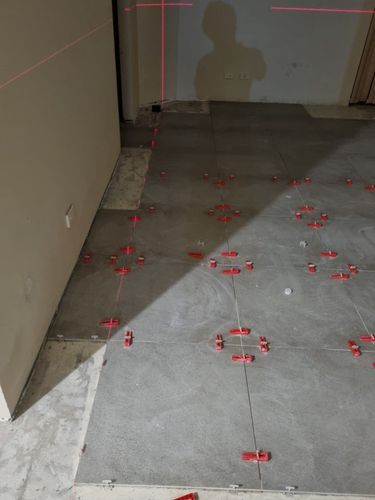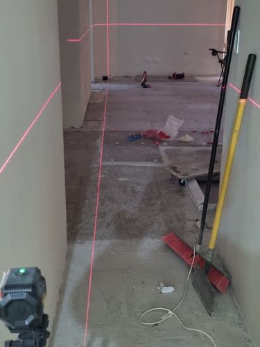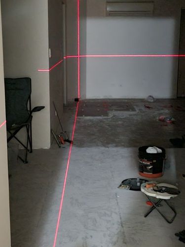 It looks to be coming along nicely, and that laser level is going to give you nice clean lines. They are one of the handiest tools to have when tiling as they give you perfectly straight lines to work off of while allowing you to have two hands free to work.