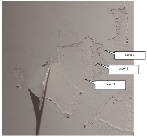 I am planning to sand / grind off layer 1 / 2 of paint and leave the white plaster-type base - layer 3. Then apply a sealer / binder / base coat before applying primer and paint. Layer 3 you can scrape with a spatula, but it is a lot of effort - so was planning to use my angle grinder.