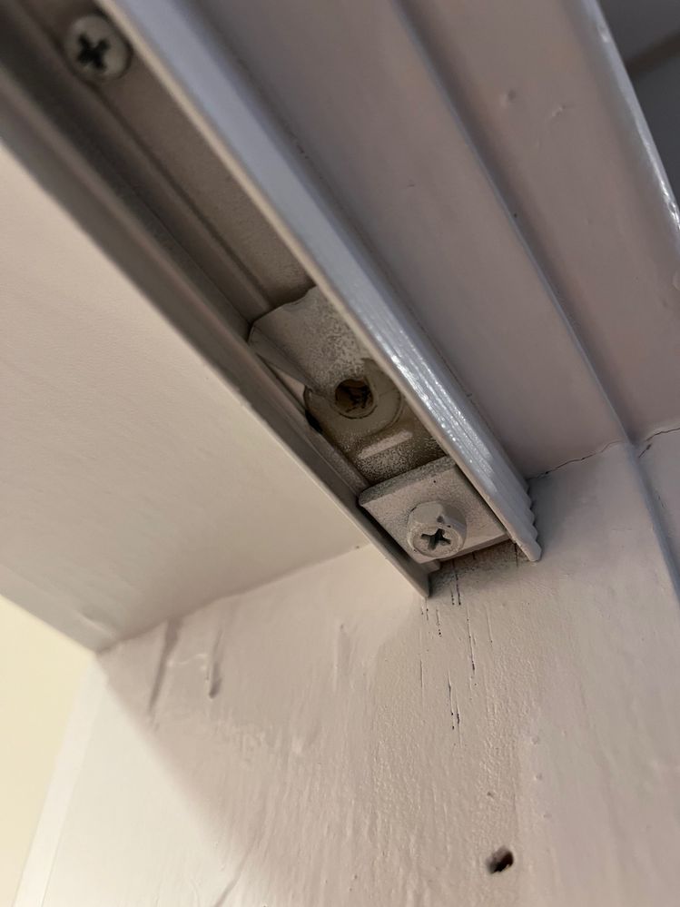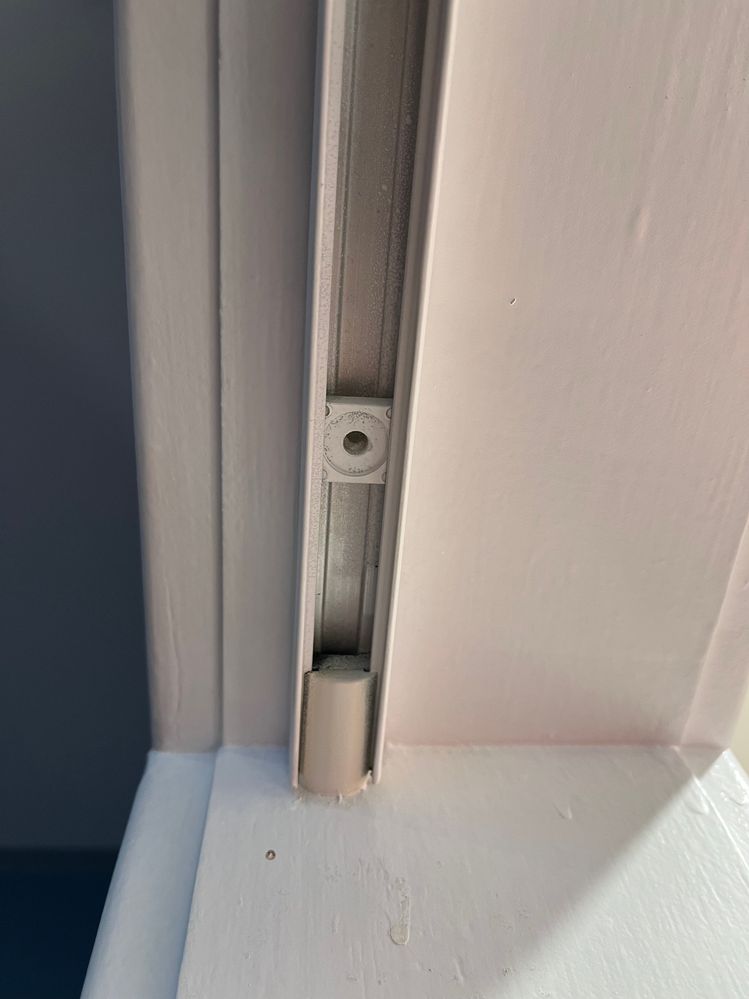 The pivot holes are at the edge of each leaf and there seems to be a superfluous one in the middle. I have the mounting pin for the bottom and all that's left of the top pivot is a conical spring and a washer. I tried unscrewing and removing the track to look for a manufacturer but it's either been glued in or effectively glued with paint. I suppose I might need to remove it anyway to get the runner back in correctly.