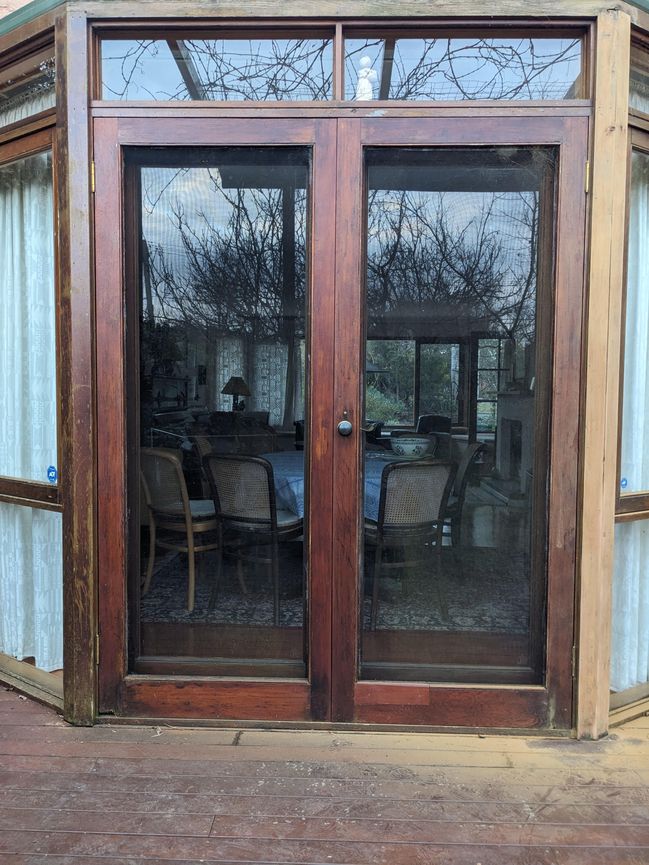 There is no glass in the doors, only insect screen which I intend to renew. The photo may be misleading because of the glass in the doors behind (which are in good condition).