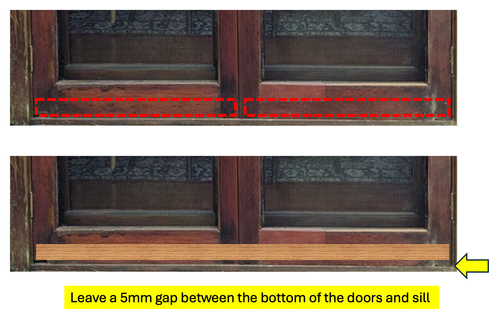 Where I think the rot has been able to form is because it appears the bottom of the doors are virtually touch the sill, which means water can be trapped between for some time before evaporating. So, I would allow at least a 5mm gap between the bottom of there door and sill. Then consider one of the Raven weather strip products to prevent and drafts or rain water.