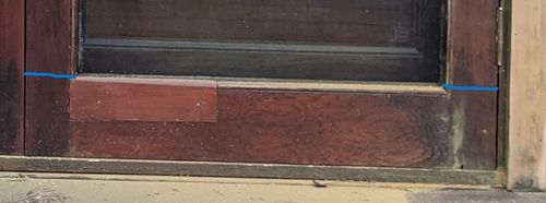I plan to replace the full width of the bottom boards - the one on the right has already been patched to cover an area of water damage so I might as well make it whole. I have a couple of cedar boards 140mm x 30mm which should do the job. I'll make the cuts in the verticals to leave 5mm space at the bottom above the sill, as you suggest: you're right about the water being retained in the present gap. There'll be a minor difference in level with the interior glass doors but I don't think it will be noticeable enough to warrant trimming the new boards to match exactly (I'm using hand tools).