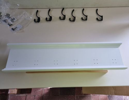 Using some left over wood from my side table, I bought some more pine moulding and decorative hangers from Bunnings and made a large key rack, painted using wood primer and Dulux Aquanamel in Lexicon Quarter. Wood attached with aquadhere glue (limit gap) and wood filler where needed. Hooks attached with screws. Slide compound saw used again.