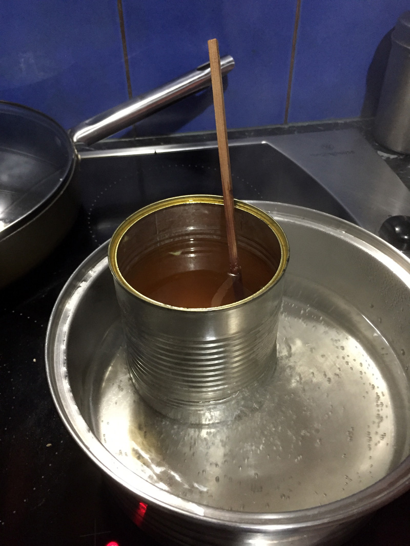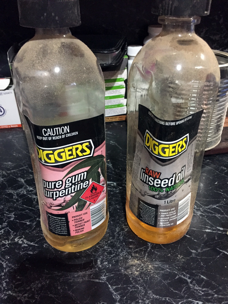 Use an old fruit can, pour in the Linseed Oil and Turpentine and place in a saucepan of water and boil, cut up the Bees Wax into smaller sections add the pieces and stir in.