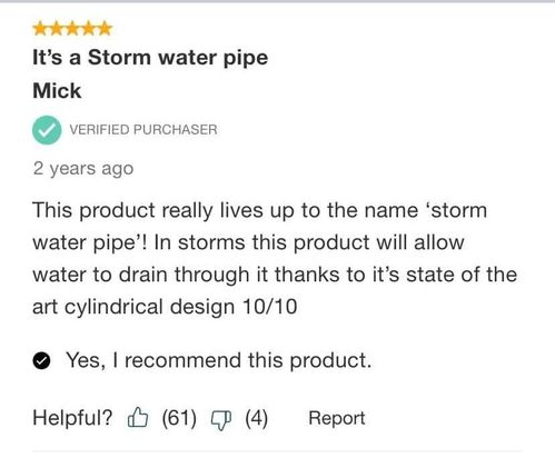 Not a project as such, but I thought these Bunnings product reviews of PVC stormwater pipe might give everyone a laugh.