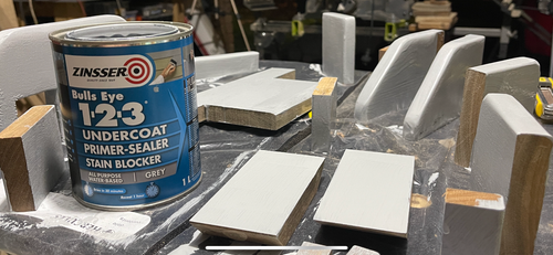 I’ve made all of the cuts and I’ve done a ‘dry assembly’ and then I’ve primed all of the timber where I won’t be applying glue. The Zinsser Bullseye 123 is an amazing primer and I am seriously impressed with its quick drying and easy clean up. The paint team at West Gosford Bunnings know their paint!