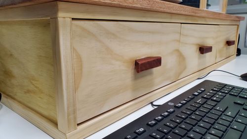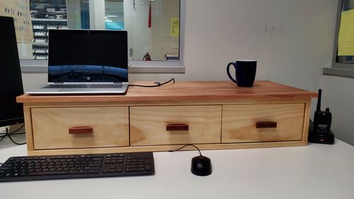 I wanted a laptop riser for work; however, the ones they can provide was not something I like aesthetically. I therefore made one from a bit of plywood, Okume panel (top), pine, a bit of Jarrah, screws, glue and drawer runners.