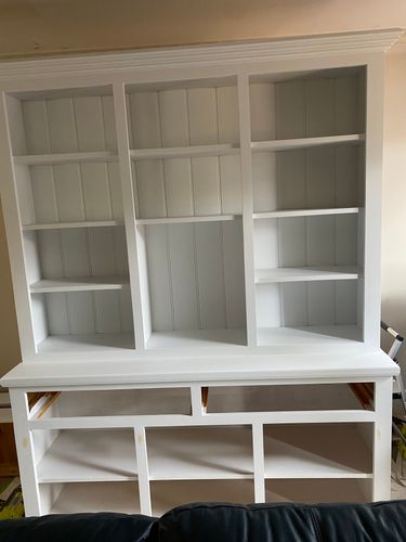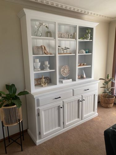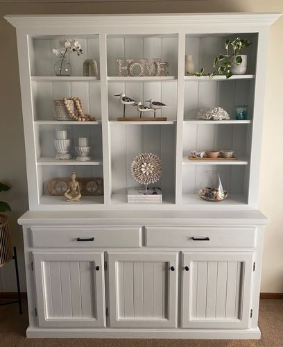 This is my completed upcycling project where I transformed an old Pine Timber Buffet & Hutch into a stylish Coastal meets Hampton cabinet. I wanted a fresh look without the price tag of new furniture.  The project involved cleaning and scuff sanding the wood, replacing the particle board with VJ panels from Bunnings, and applying a primer. I then applied two coats of chalk paint in 'white linen' and sealed the finish with a wax. To complete the transformation, I added black handles from Bunnings, giving the piece a fresh, modern look while maintaining its classic charm.