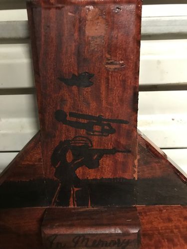 This is a Vietnam War memorial, in replica of the Battle of Long Tan cross, made from recycled red gum wood and with detailed silhouettes. A lot of time, inspiration and joinery skills went into this project. This is the second Vietnam War memorial cross I have completed, and like the first one, this one will also be donated to a local RSL club