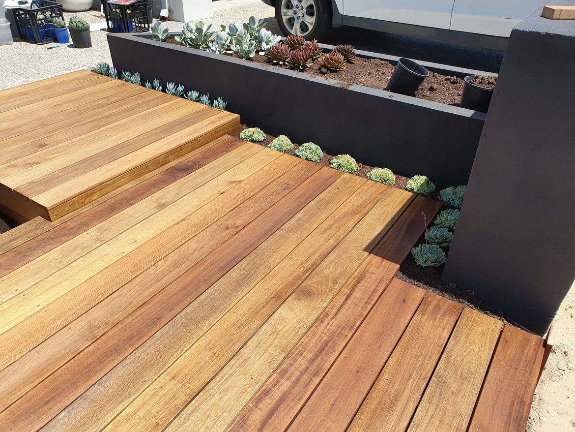 Got my front deck finished - beautiful Pacific Teak. Just needs a final coat of oil but going to finish the areas around it first as too much sand/soil is still getting tracked across it.