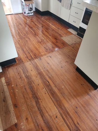As you can see some areas are bare, some have just had a sealer and a portion of the kitchen had been coated with some gloss finish product.