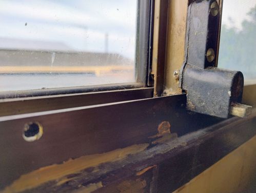 Note the drilled hole in the frame that allows the window to be locked in the open position.
