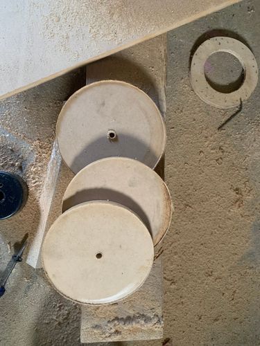 The Botton disk was cut with a 70mm hole saw bit and the top I made too big. The bottom suspension kit went right through. I correct this by adding a large washer at the inside of the pendant and required through the gap. So measure the fitting and definitely make a smaller hole for the top.