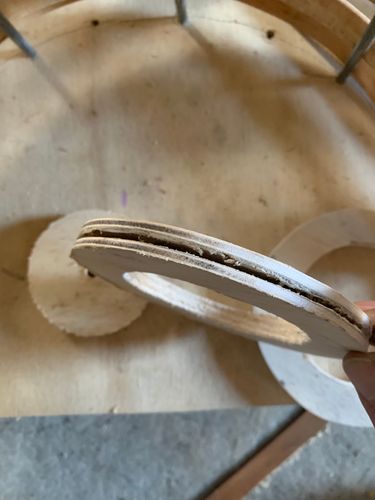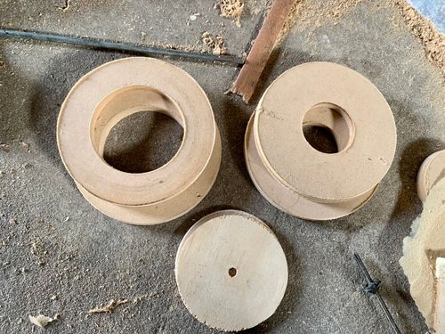 To start, I looked at all off cut Timbers I had and decided to make the top and bottom ring plate with MDF ( I definitely would use Ply in the future or pine). I used a 120mm hole saw and cut 4 pieces. The MDF was 12mm
