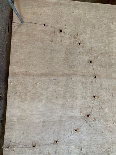 I used anything I had around and placed them in the holes I drilled. The wood strips were wiped down and carefully bent around the supports as below.