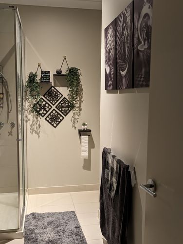 I moved into a duplex with a ensuite bathroom with peachy pink tiles with brown accent tiles, cream walls and cream floor tile with grey grout. As thi ...