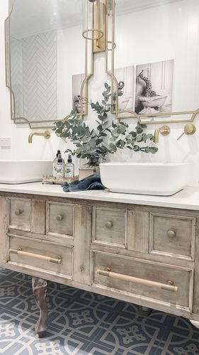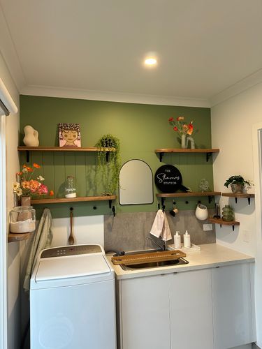 This is a complete overhaul of our early 90’s colonial style laundry into a Mediterranean Farmhouse style, using Kaboodle cabinetry (Alpine - Macaron) ...