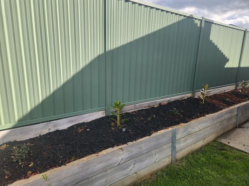 Weedmat over area including broader. Filled with compost and soil mixes. Topped with red cedar chips. Two dwarf lemon trees with jasmine ground cover ...