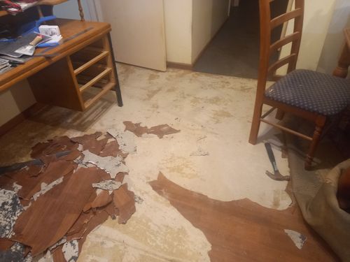 my house had stick on tiles in the kitchen + meals area and sheet laminate in the dining room