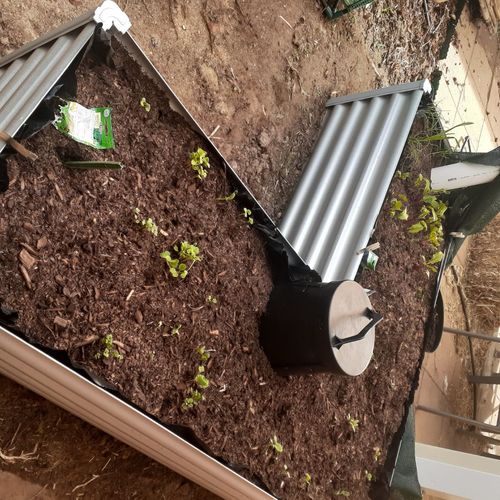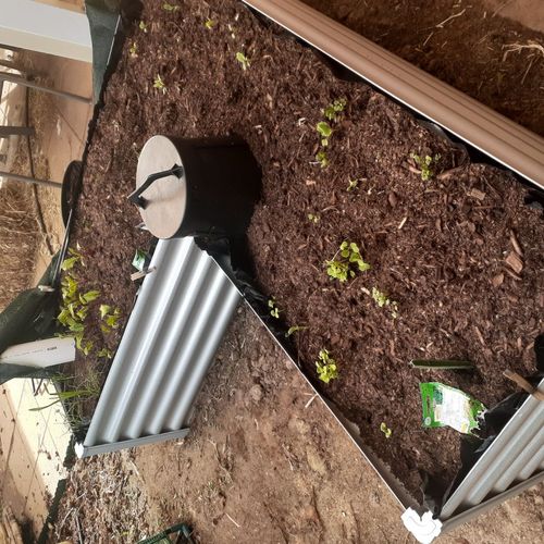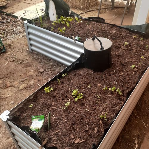 Raised garden bed, seedlings First up place some gravel, rocks, flattened old cardboard boxes, newspaper and pea straw in the bottom, this will kee ...