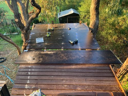 now for the (form) ply flooring to go under cubby part. 19mm film ply. A chalk line was perfect for tracing where beams were underneath !view ain't ha ...