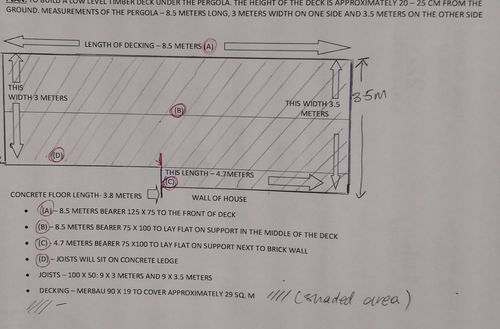 Hi, I plan to build a low level deck, 8.5 meters long, 3 meters wide on one side and 3.5 meters on the other. To cover the 8.5 meter length on the fro ...