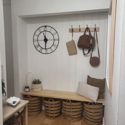 Made over our home entry way, it was boring and not functional (the cupbaord was only 20 cm deep). Created a cute mudroom type entry that is light ...