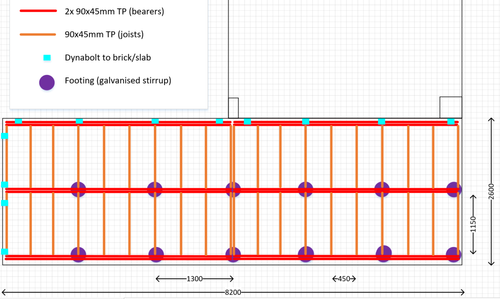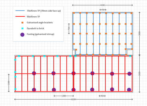Hi @EricL Thanks for the responses and links. I've put together the below plan based on: - Framing over the tiled area will use 70x45 TP with the 70m ...