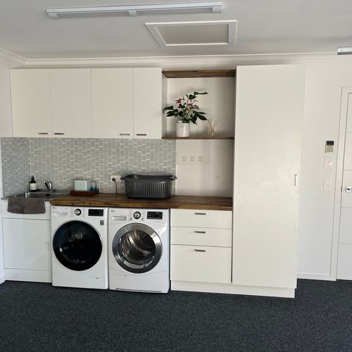 A corner of the garage was transformed into a spacious laundry using Flatpax cabinet users, mosaic tiles, timber benchtop and Flexi Storage shelves ...
