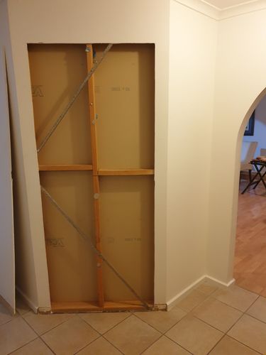 Small bar off Lounge.Closing off old entrance. want to make new doorway through drywall in hallway. Cot out drywall on hall side encountered steel bra ...