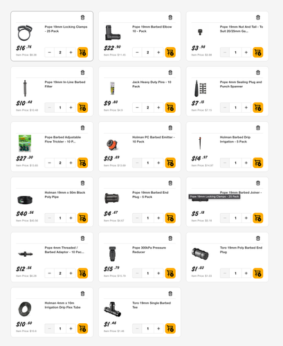 Thankyou @MitchellMc Ill stick to the 19mm poly pipes, and place emitters where needed. let me go thought my part list and update it to be compatible ...