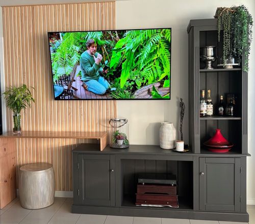 Large 80's orange pine wall unit, upcycled into contemporary cabinet framing large screen TV and feature wall Centre of lower cabinet squared off, ...