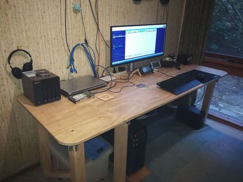 The table was originally 2.4 Metre x 1.2 Metre by 17mm GuaraPly pine, cut down to 2.1 Metre x 80 CM.I cut out cable guides at the back with a jigsaw, ...